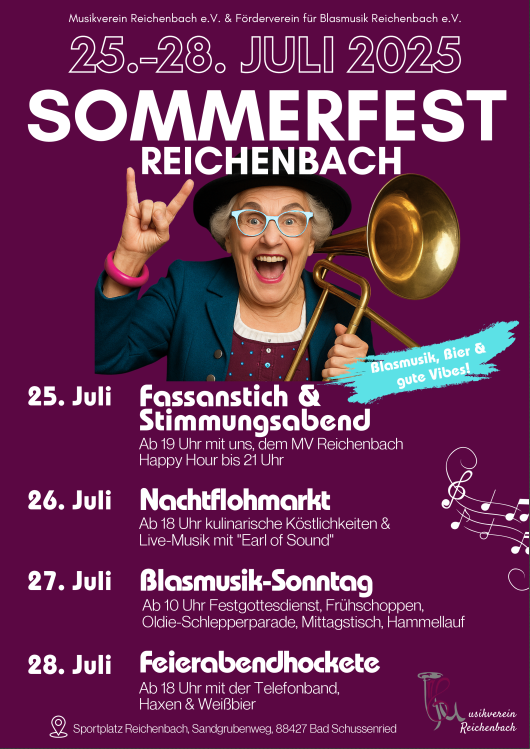 Das traditionelle Sommerfest von Freitag, 25. Juli bis Montag, 28. Juli 2025 eröffnet der Musikverein Reichenbach am Freitagabend mit einem Fassanstich mit Stimmungsabend. Am Samstag verwandelt sich das Festgelände in einen ganz besonderen Ort: Der idyllische Nachtflohmarkt in und um das Festzelt mit verschiedenen kulinarischen Köstlichkeiten und Live-Musik mit „Earl of Sound“ laden am Samstagabend ab 18 Uhr zum Trödeln, Feilschen, Einkaufen und Probieren ein. Wer einen Standplatz möchte, kann sich hier anmelden.