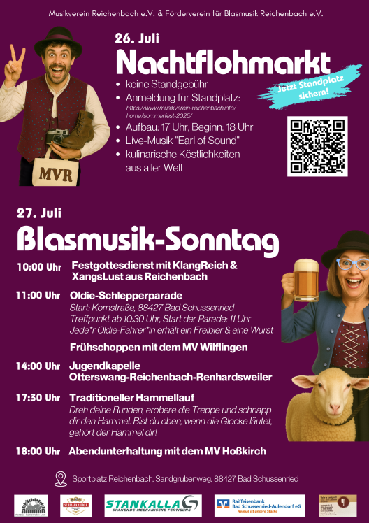 Das traditionelle Sommerfest von Freitag, 25. Juli bis Montag, 28. Juli 2025 eröffnet der Musikverein Reichenbach am Freitagabend mit einem Fassanstich mit Stimmungsabend. Am Samstag verwandelt sich das Festgelände in einen ganz besonderen Ort: Der idyllische Nachtflohmarkt in und um das Festzelt mit verschiedenen kulinarischen Köstlichkeiten und Live-Musik mit „Earl of Sound“ laden am Samstagabend ab 18 Uhr zum Trödeln, Feilschen, Einkaufen und Probieren ein. Wer einen Standplatz möchte, kann sich hier anmelden.